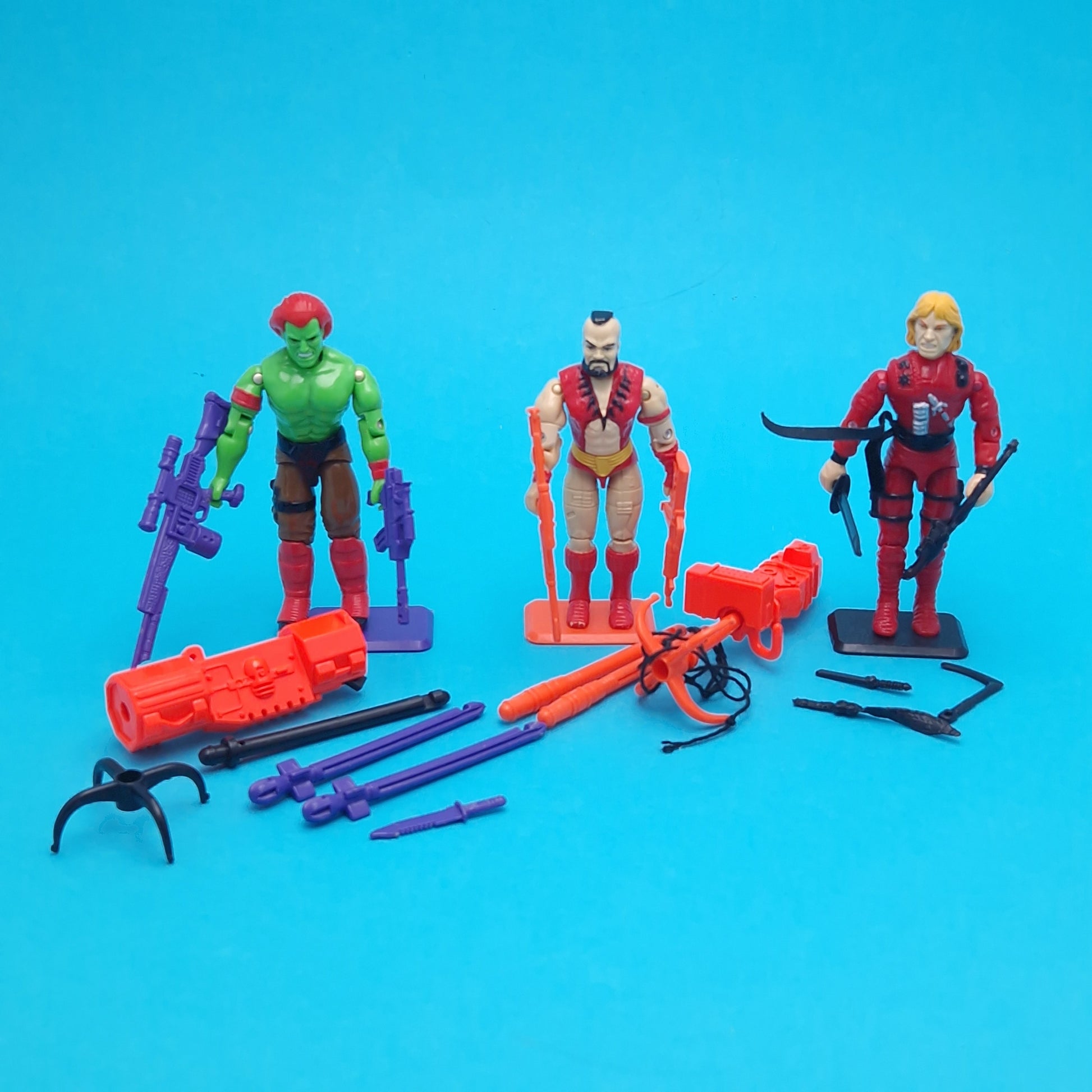 The item comes as seen in the image and the condition of this is played with and used, but still in good condition, includes all parts that you see in the image. they stand really well, Blanka legs slightly loose, kens weapon chewed but and has hardly been played with, would look great on display. action rocket works.