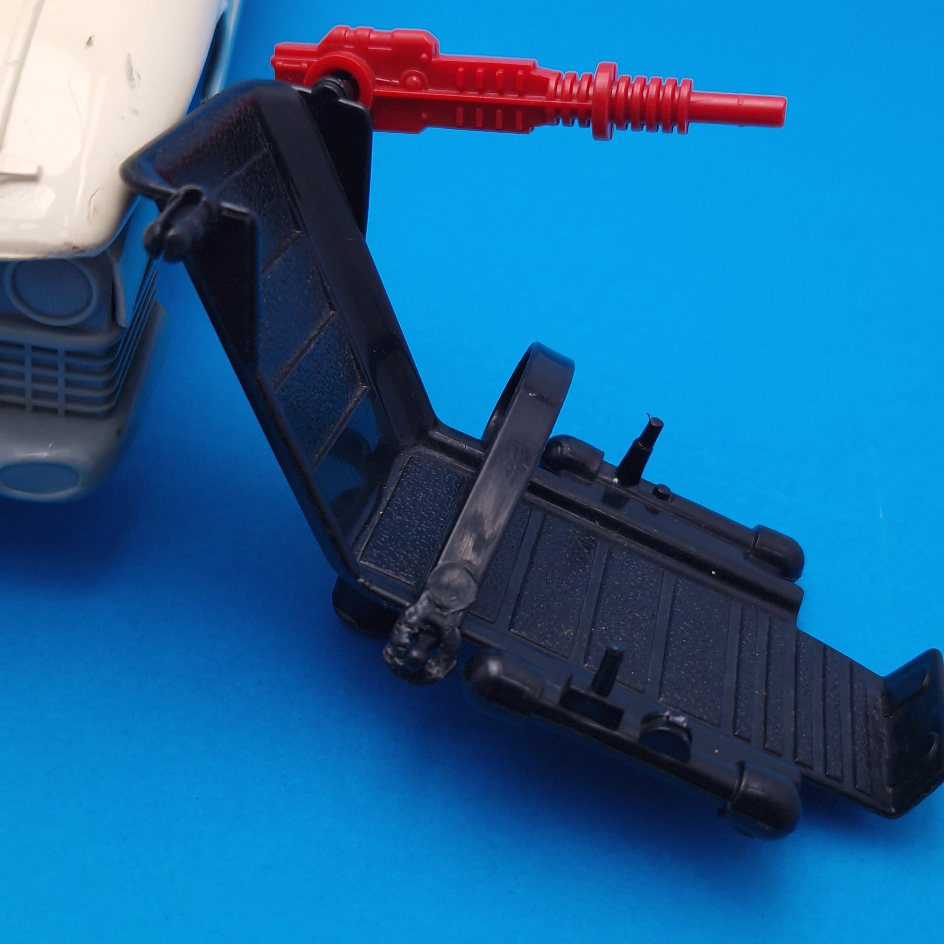 The item comes as seen in the image and the condition of the figure vehicle is used and played with, but in ok condition, the white is turning yellow, the images cant quite show it, but there is discolouration and gives it that old effect. gun missing on the chair otherwise okay condition, the winch doesn't work as snapped, but may be able to be fixed as nothing broken. includes ghost. Shows signs of play wear but looks okay on display.