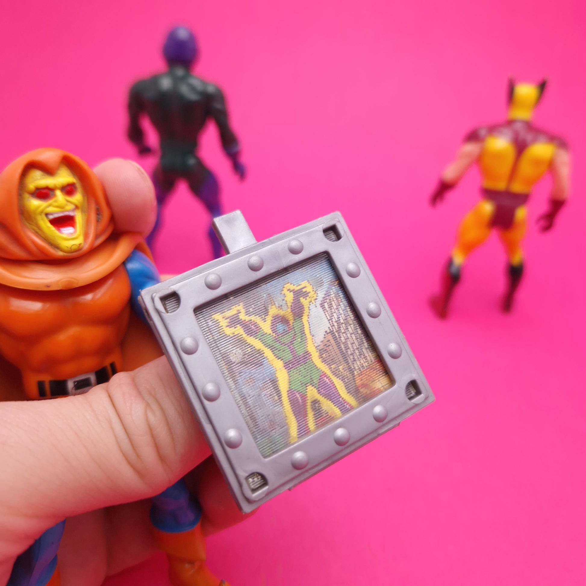 The item comes as seen in the image and the condition of the figure is played with and shows wear from play. Kang is ok missing parts, stands ok. Hobgoblin has had legs glued slightly for stiffness, but can still move, has difficulty standing, wolverine is ok and shows wear and stands ok. Will have play wear and scuffs but still good for display.