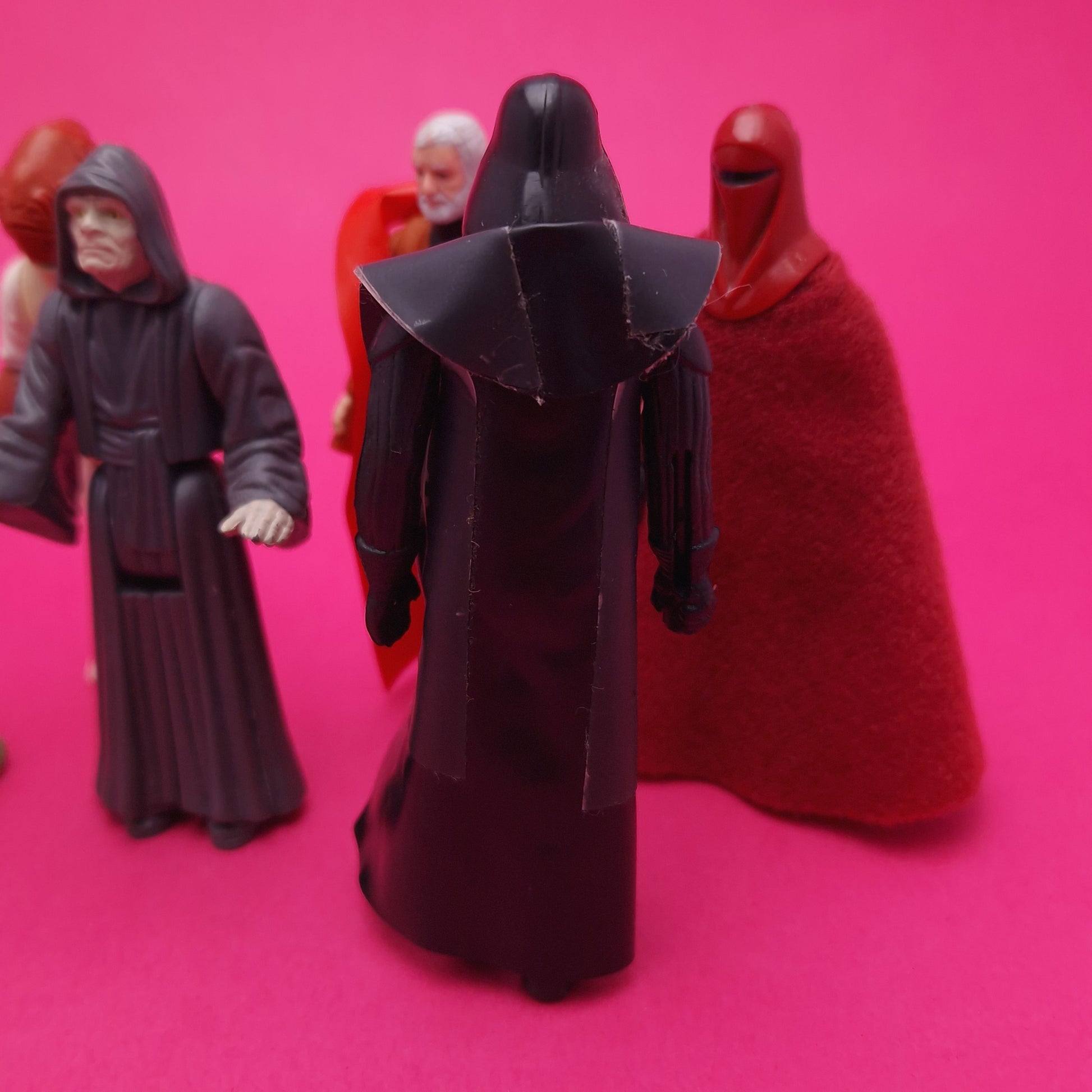 The item comes as seen in the image and the condition of the figure is played, has a few scuffs but nothing major. all missing original Weapons. i suspect obi wans cape is repo, and Vader's is broken and taped. all Stand Nicely. looks good on display, with slight yellowing but not much.